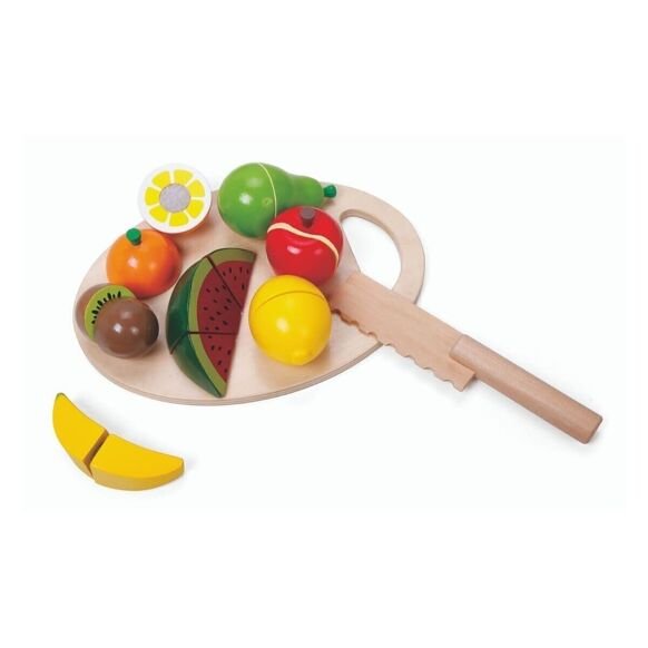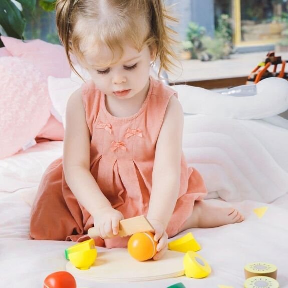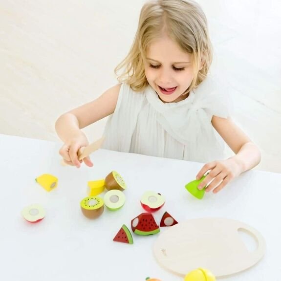 Aidez les enfants Ă  reconnaĂźtre diffĂ©rents fruits et Ă  exercer leur motricitĂ© lorsqu’ils coupent les fruits en bois.votre enfant pourra vous imitez et aura de quoi prĂ©parer un bon repas !🍛​
