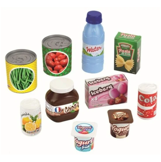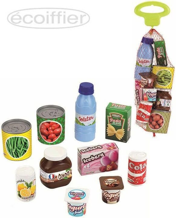 ⭢ 2 boites de conserve de tomates et de haricots verts, une boite de pâtes, un pot de pâte à tartiner, une boite d’esquimaux, 2 yaourts, une bouteille d’eau et 2 sodas.